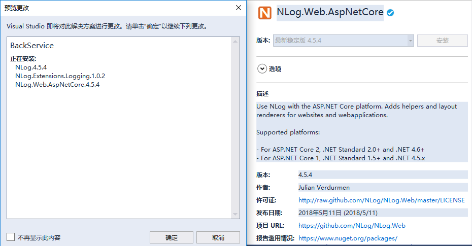 在NuGet中搜索并安装 NLog.Web.AspNetCore , 当前版本是4.5.4