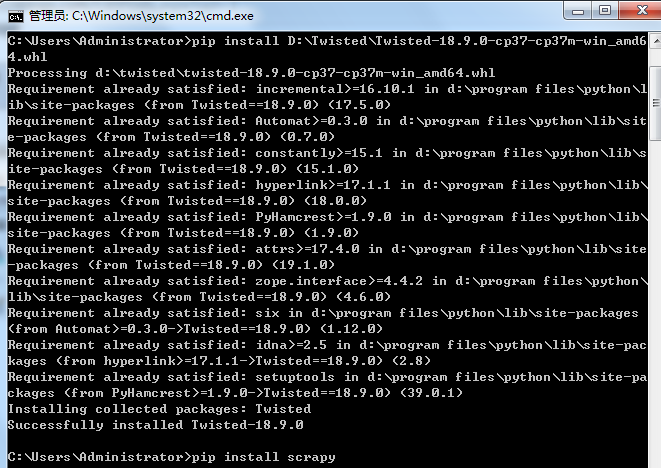 5.在cmd中输入DOS指令:pip install D:\TDownloads\Twisted-18.9.0-cp37-cp37m-win_amd64.whl