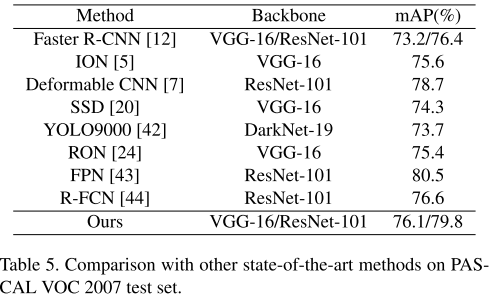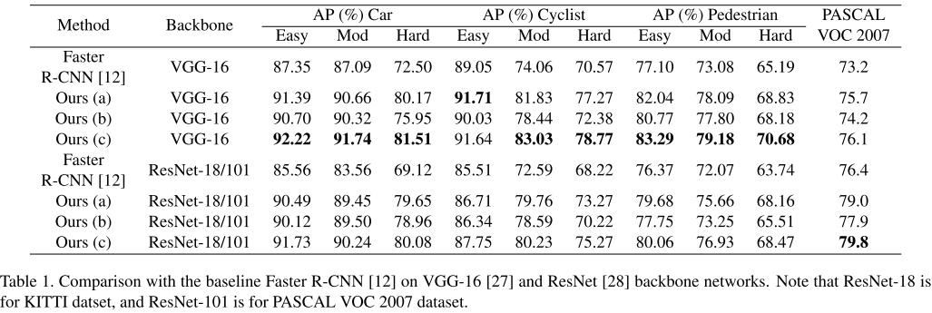 1) 对比+消融:使用相同backbone与faster R-CNN间的效果对比,以及模块间的消融实验结果。使用两个backbone,本文的方法效果对比Faster R-CNN均有较大的提高,最高分别提升2.9与3.4个点。每个模块的使用也都有相应的提升。其中(a)为仅使用location-aware deformable convolution,(b)仅使用backward attention filtering,(c)同时使用两个模块。