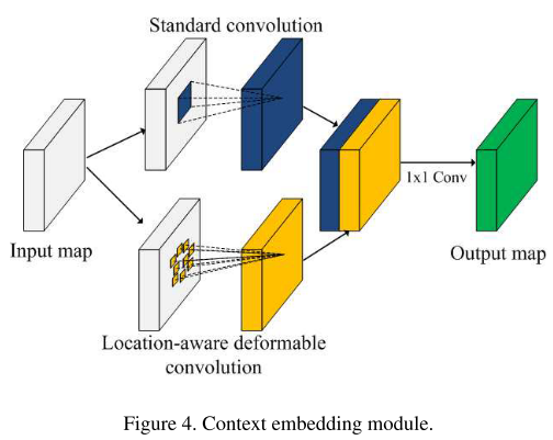 Location-aware deformable convolution的目的是为了获得更丰富的上下文信息,得到的结果需要与标准卷积的结果一起处理,将两者concatenate起来,然后使用1×1卷积压缩到原来的通道数组成最终的输出特征。