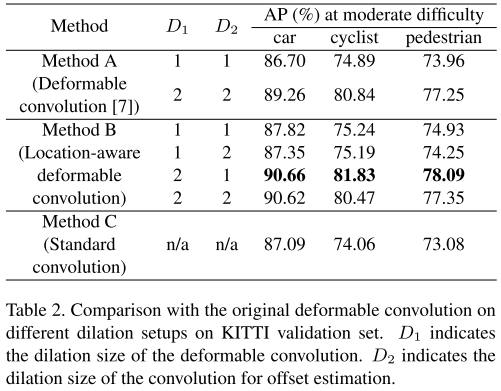 2) 对比+消融:Location-aware deformable convolution模块与一般的convolution以及deformable convolution间的对比,同时对比了不同膨胀率的结果。可见,最优的结果是使用膨胀率为2的膨胀卷积,使用标准卷积进行offset预测。