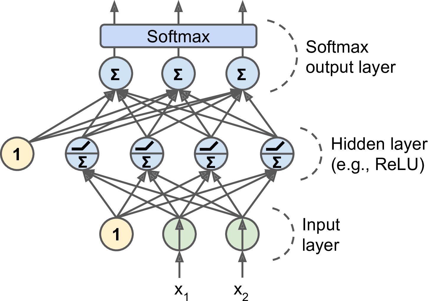 训练 MLP 的算法是后馈训练算法(backpropagation training algorithm)。后馈训练算法也就是使用反向自动求导(reverse-mode autodiff)的梯度下降法。