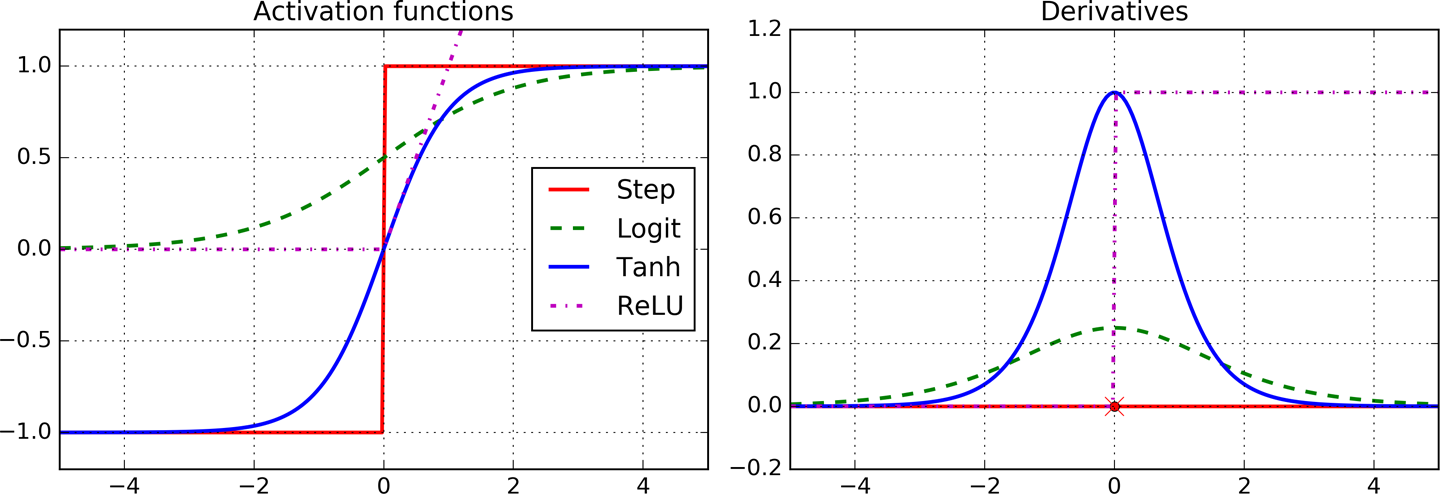 为了很好地实施后馈训练算法,D. E. Rumelhart 对于神经网络架构做了重大的改变:把阶跃函数改为了几率函数(logistic function)$f(z)=\frac{1}{1+e^{-z}}$。因为阶跃函数导数都为 0,无法实施梯度下降;而几率函数处处可导。
