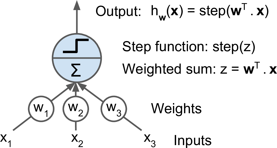 感知器基于线性阈值单元(Linear Threshold Unit, LTU)构件的。以下是 LTU: