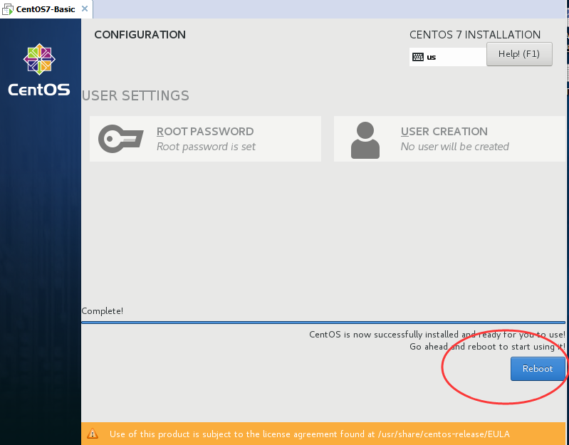 10 等待几分钟后,系统安装完成,会提示让我们重启,点击重启按钮,就可以进入CentOS7操作系统了。(安装过程大概10分钟左右)