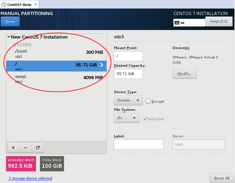 - 剩余的空间给/data分区,这里没有单独分/data分区,因为虚拟机一共就100GB的空间,这里做实验用,就没有单独额外分。