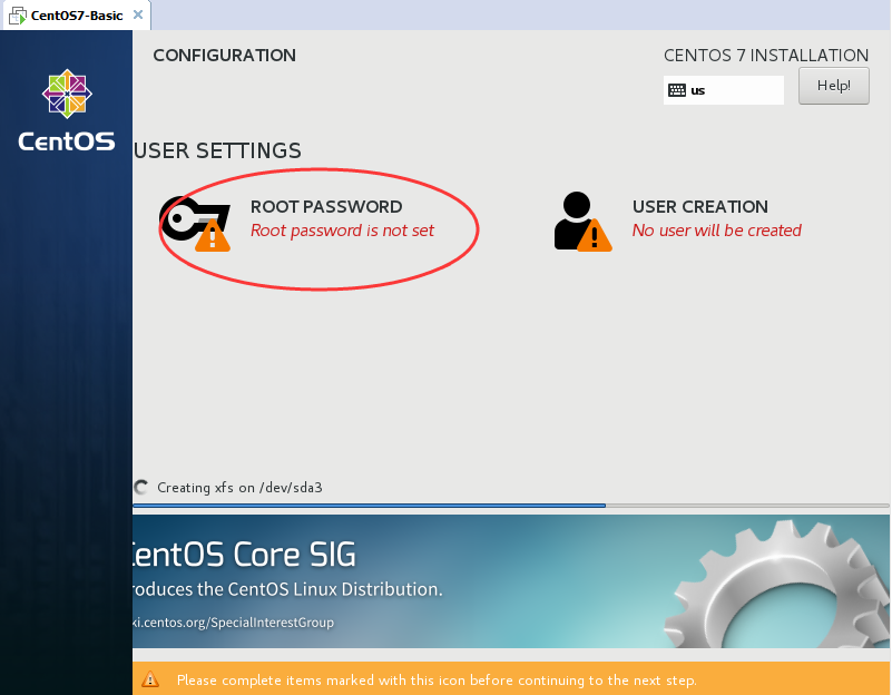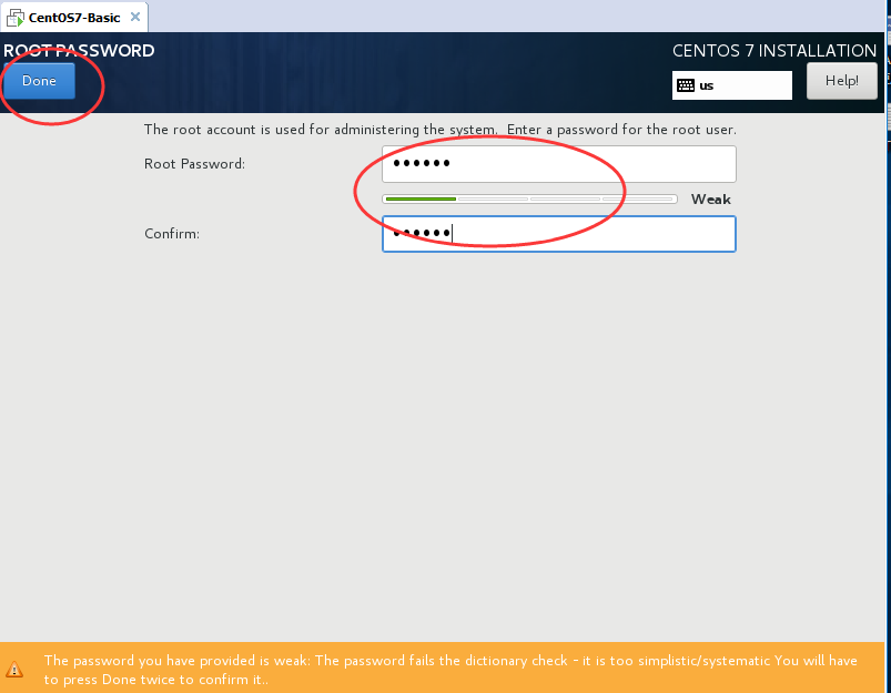 设置ROOT用户的密码,ROOT用户就是CentOS操作系统的超级管理员,密码是必须要设置的。点击它进入设置ROOT密码的界面。这里设置root密码123456。