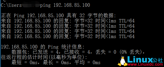 可以看到其中eno16777736对应的ip已经改变,此时在主机中ping 192.168.85.100验证是否可以ping通: