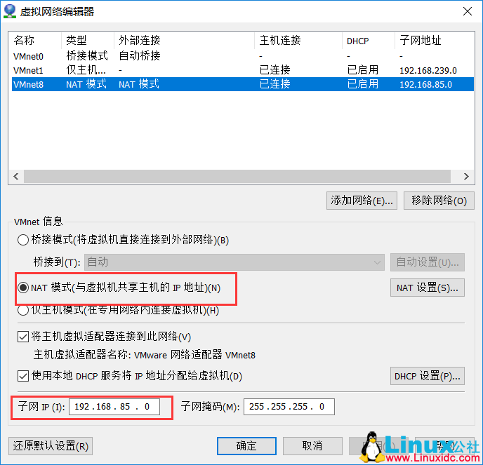 这里我将子网IP设置为192.168.85.0