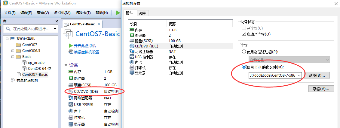 6 点击CentOS7-Basic 设置光驱内ISO映像文件,选择自己下载的CentOS-7-x86_64-DVD-1804.iso,点击确定