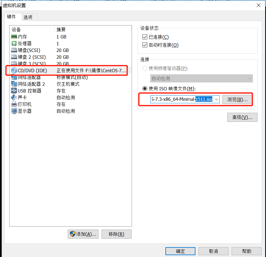关掉虚拟机,在虚拟机CD/DVD选项中选择准备好的centos6镜像。