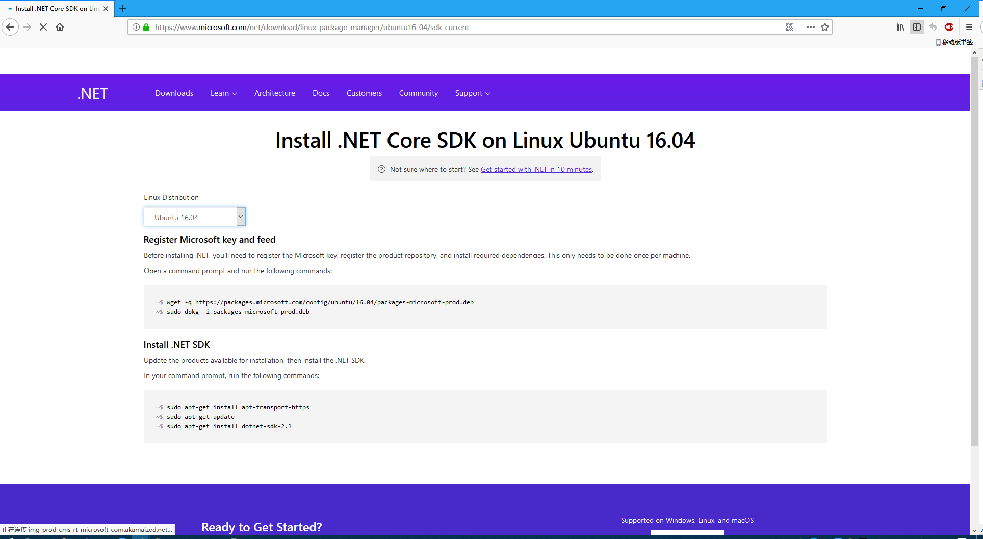 这一步很简单,我们只用到 .NET Core 的官网找到刚才我们查到对应的 Ubuntu 版本的 .NET Core 运行环境进行安装岂可。