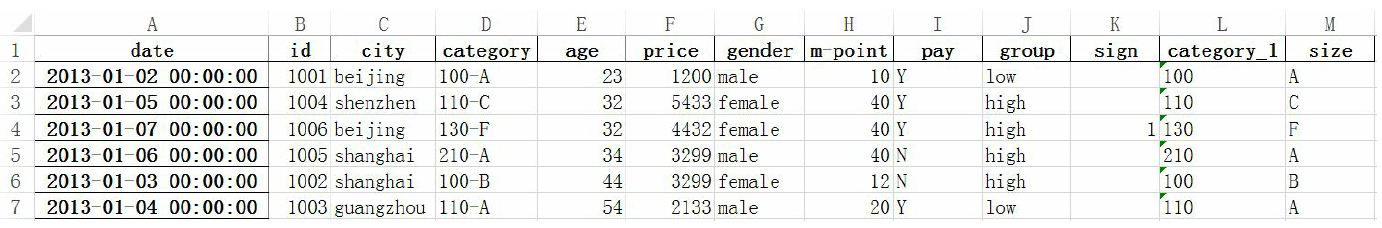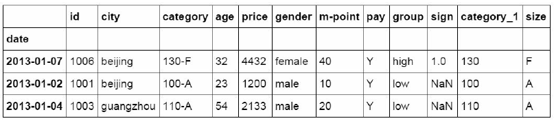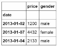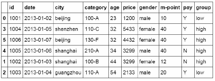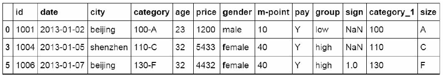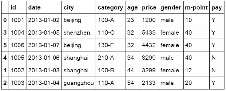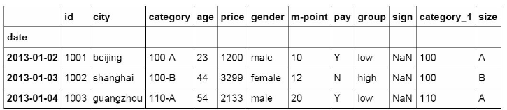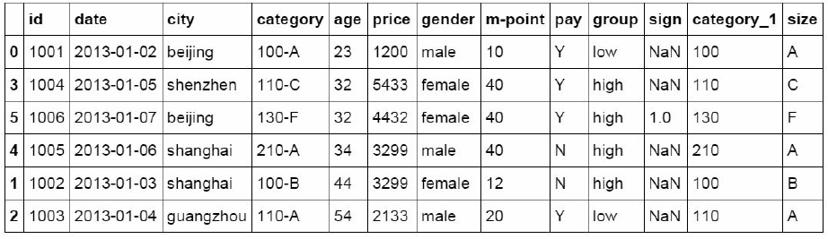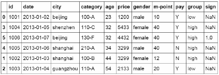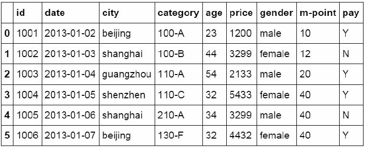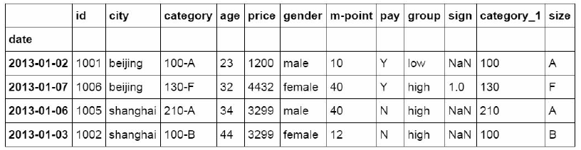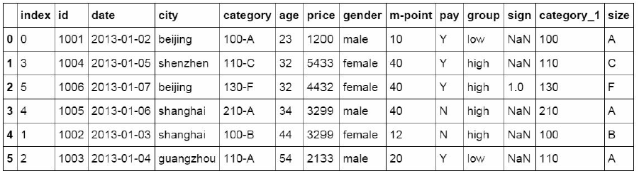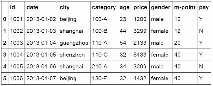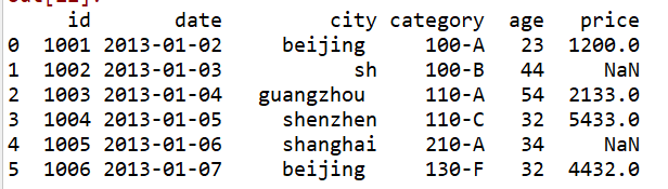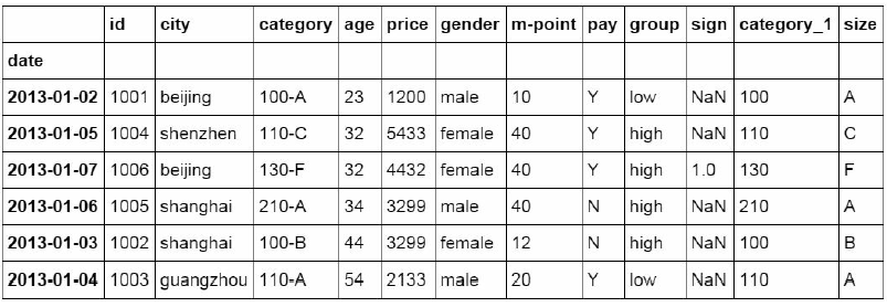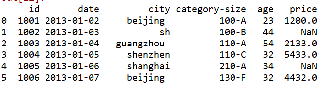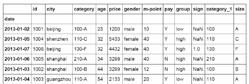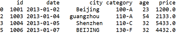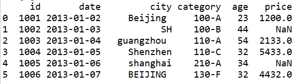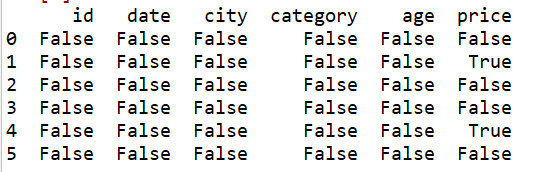 Index(['id', 'date', 'city', 'category', 'age', 'price'], dtype='