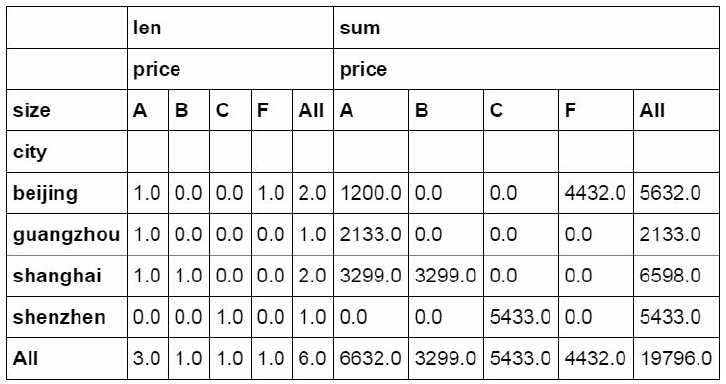 "size"],aggfunc=[len,np.sum],fill_value=0,margins=True)