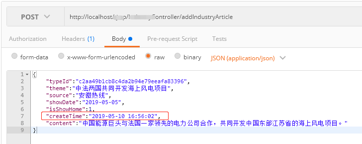 createTime变量使用了字符串类型,接口接收参数后将该字符串转为日期时,发生错误,项目中使用fastjson来处理json数据。