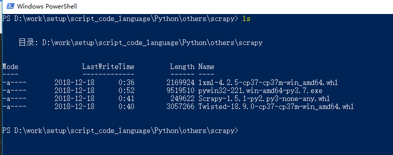 PS D:\work\setup\script_code_language\Python\others\scrapy> pip install .\Scrapy-1.5.1-py2.py3-none-any.whl # 4) 安装scrapy