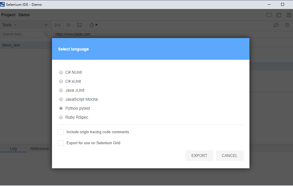 在使用selenium IDE导出的文件中,可以看到使用了pytest包。它是 python 的第三方单元测试框架。