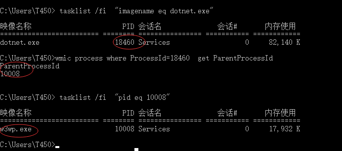 w3wp.exe、dotnet.exe的互动关系是通过父子进程维系的。下图脚本力证dotnet.exe进程是w3wp.exe创建出来的子进程: