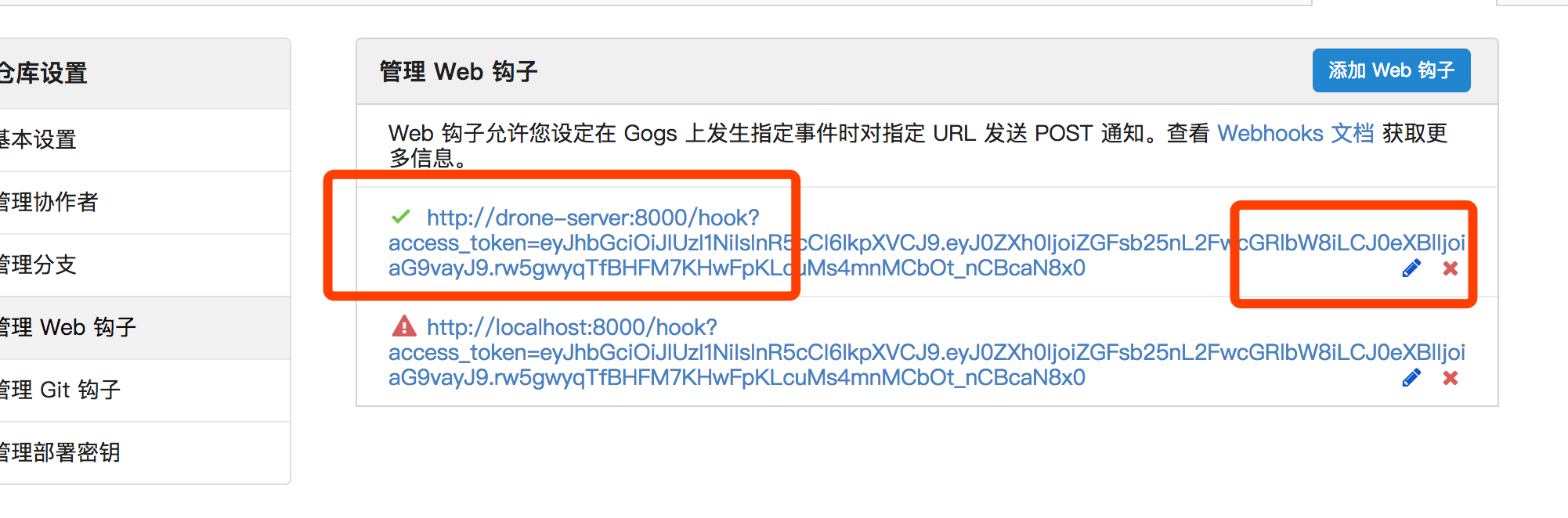 说明,因为都是本地环境,会有一个webhook url 的问题,drone 调用api 写入的是localhost:8000 造成webhook 无法生效,可以参考如下配置