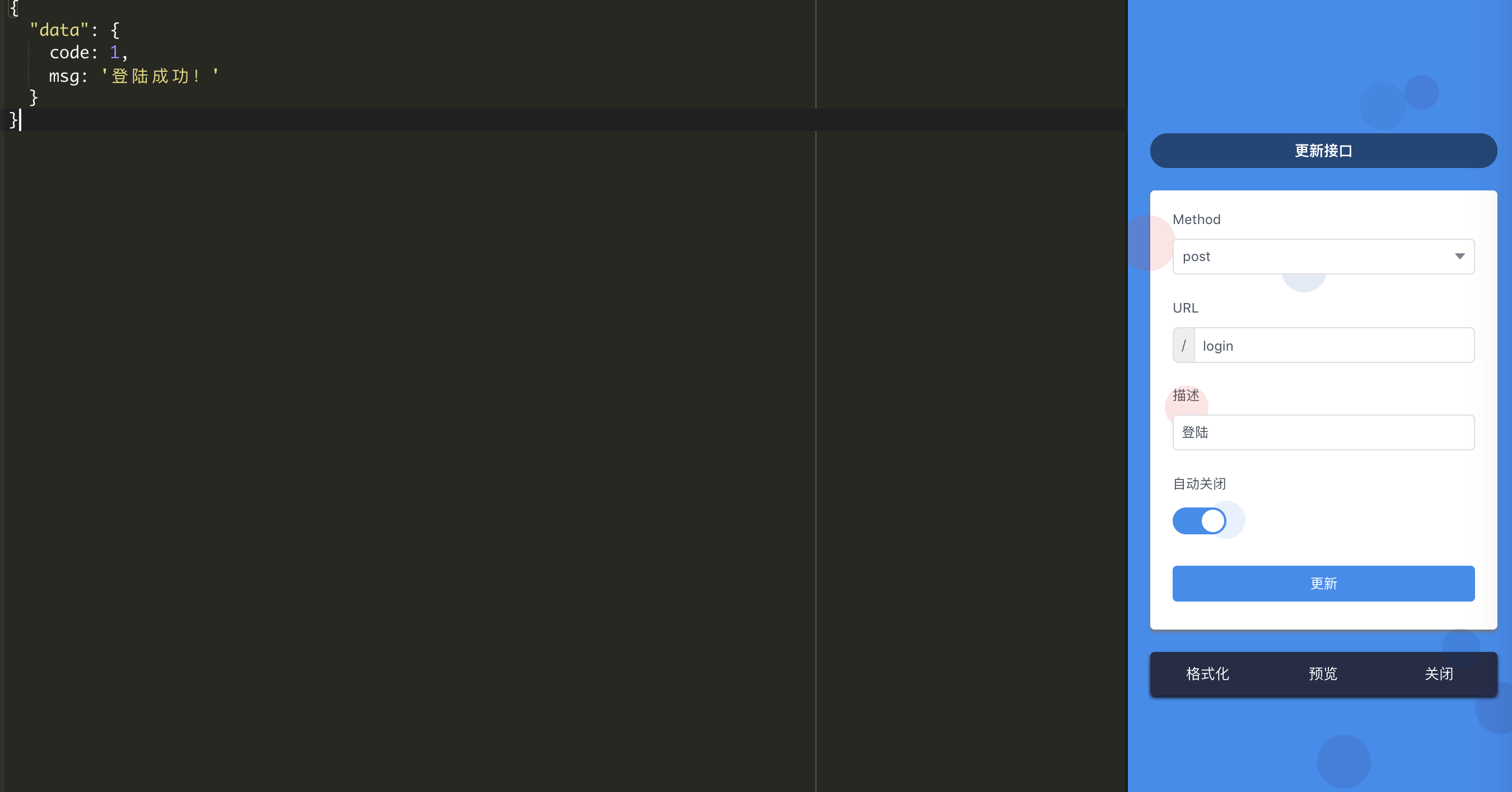 这样一个接口就定义好了,我们可以通过请求工具访问,就可以得到 /login中刚定义的数据。更多定义easy-mock返回数据格式的方式,具体请参考官网例子。参考其他例子:https://blog.csdn.net/qq_42991509/article/details/94577331