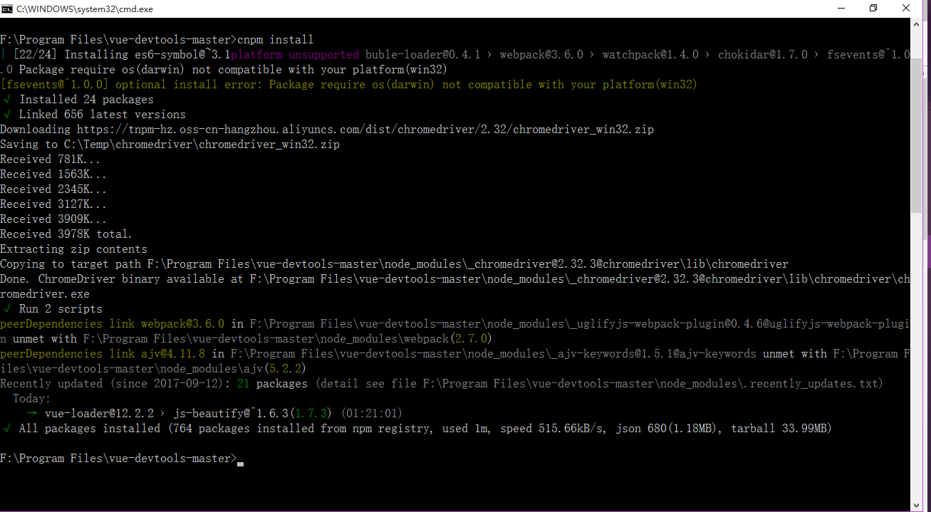 2)下载好后进入vue-devtools-master工程 执行cnpm install, 下载依赖,然后执行npm run build,编译源程序。