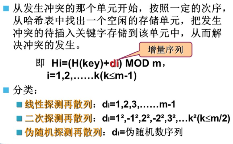 二次探測法的地址增量序列为 di = 12, -12, 22。 -22,… 。 q2, -q2 (q <= m/2)。二次探測能有效避免“聚集”现象,可是不可以探測到哈希表上全部的存储单元,可是至少可以探測到一半。