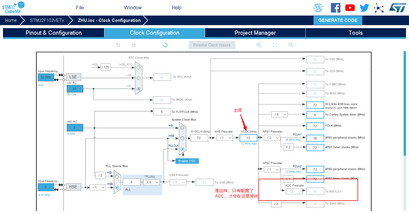 - (4)完成时钟树配置:主频72M