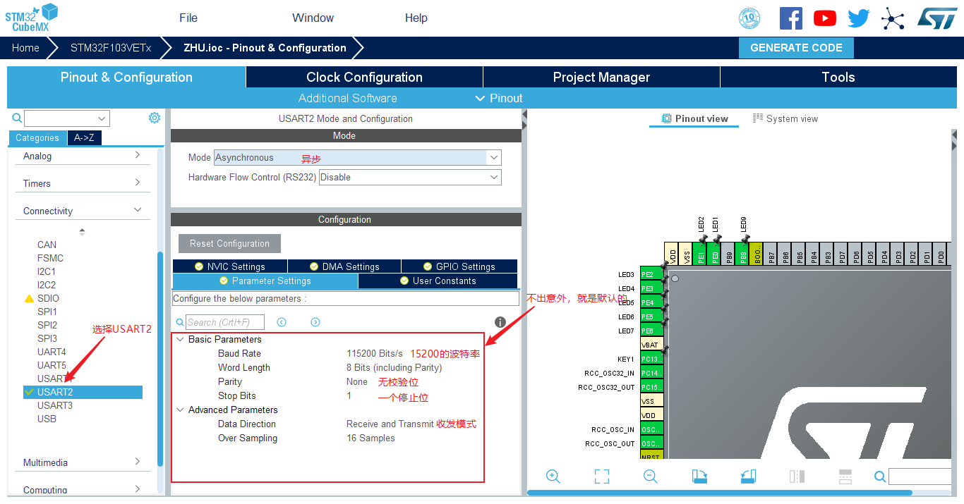 - (2)USART2的设置为:波特率115200bps,8位数据位,1位停止位,无校验位。