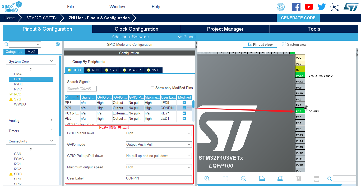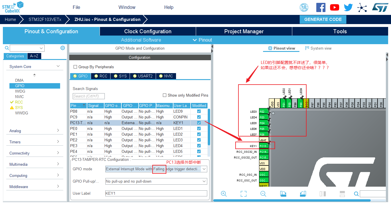 - (1)LED1-LED9和KEY1所在的GPIO的配置、串口