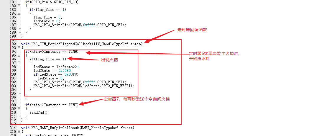 4、监测端每隔2秒向采集端查询一次火情,当采集端出现火情时,监测端的LED1至LED4按指定流水灯方式显示。当采集端火情消失后,监测端的LED1至LED4应保持流水灯显示方式。具体流水灯显示方式为LED1亮起->LED2亮起->LED3亮起->LED4亮起->LED1至LED4全部熄灭->重复前述效果,各显示切换间隔为1秒。