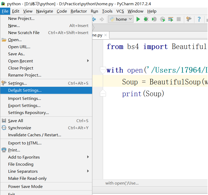 1.点击File,选择Default Settings选项