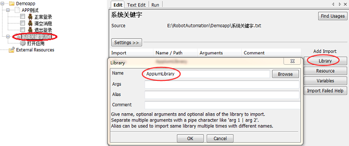 1. 在系统关键字上导入AppiumLibrary库