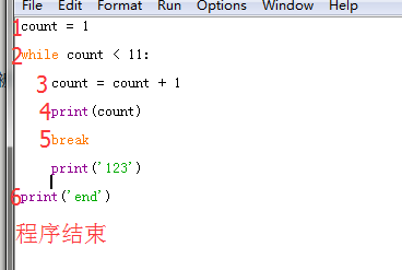 这里的print('123')也不能被执行到,遇到break语句直接跳出循环,只能执行一次循环,即输出一次print(count)语句