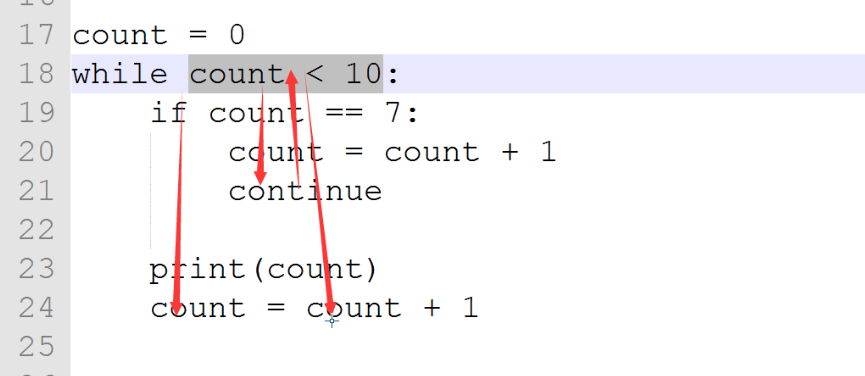 当while执行到if count ==7时,遇到continue,下面的print语句和count=count + 1不会被执行,重新跳回while语句