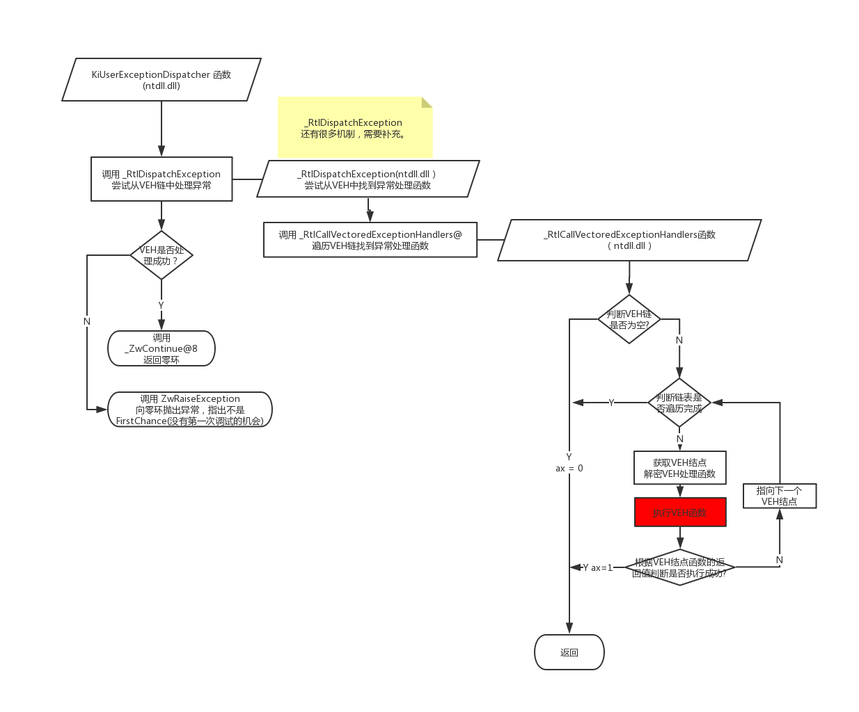 该函数的主要目的就是搜索VEH找到异常的解决方案,如果未找到会再次向零环抛出异常。