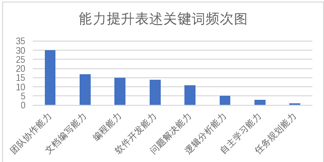 采用关键词频次统计法总结学生课程总结中关于能力提升情况的结果如上图所述。团队协作能力、文档编写能力与编程能力是学生课程总结中设计能力表述所提及的高频词。之所以产生如此教学效果,是采用“构建之法”教学理念实施课程实践教学带来的必然结果:通过个人作业、结对作业、团队作业的分层作业形式,清晰的让学生体验到不同作业层次下,软件工程要解决的关键问题。尤其是在长达13周的教学时间内,通过以软件的生命周期作为主线的软件可行性研究、需求分析、设计、实现、维护以及软件质量保证软件工程知识的传授和团队项目实验活动,更是让使学生深度理解与掌握了软件工程基本原理、开发方法与实现技术,正确理解了软件开发过程的软件质量要求和团队合作软件开发过程的真实状况;倡导“做中学”,每完成一项实验作业都要求学生完成指定要求的博客作业,博客作业的布置以较大的训练强度提升了学生文档编写能力的提升;课程按照软件工程要求,从实现用户需求的角度要求学生构造较大规模的软件程序,并且贯穿课程教学始终,期间经历了学生的课业负担重、学习压力大的种种吐槽,但当课程结束后,经历训练的学生惊喜地发现自己获得了与程序设计类课程学习不同的编程能力。马美玲同学有这样的感慨“在这一学期学习软件工程中我学到了很多东西,对于个人能力的提升有很大帮助,同时深深感受到团队合作的重要性,有计划、有效率的沟通会使团队少走很多弯路,也体会到没有实践,只懂理论知识相当于纸上谈兵。还有,想对自己说,努力吧,之后会有更多的代码等着你去敲。”邓英蓉同学认为:“经过一学期的学习,我对软件的开发过程有了更全面的理解,也认识到软件的完成依赖团队之间的良好合作。在近三个月的时间里,直到期末考试的完成,这门课的学习也结束了。但我知道,这门课对我的影响远不止于此。”