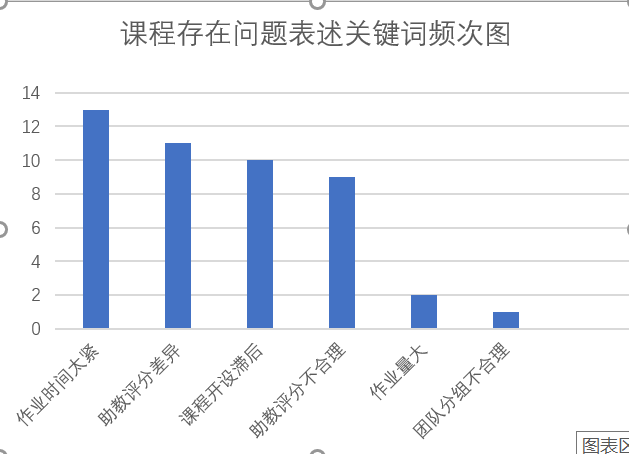 采用关键词频次统计法汇总课程教学存在问题情况如上图所述。作业时间太紧是本期课程教学中最为突出的问题,其次作业量大、课程开设滞后也是与该问题高度相关的问题。汇总造成学生感觉作业时间紧的原因,主要有:本学期课程较多、每门课程的学习任务都较重、考研复习的影响、实验过多。并认为作业时间不足,会影响到作业的完成质量。本学期课程以周为粒度发布学生作业,大致按照软件工程生命周期的工作阶段分解作业,实际实验中,软件工程的每个阶段需要耗费的工作时间是有较大差异的,统计学生完成12次周实验作业花费的平均时间(小时),标准差为1.41小时,这说明课程按周发布作业需要的完成时间是不均衡的。但是本学期教学中,未能充分兼顾各个工作阶段作业时间的不均衡特征。鉴于以上客观原因,本课程将在下一期开设中,适当合并某些实验,以加大工作量较大作业时间间隔,以减轻学生的学业压力,解决作业时间太紧、作业量过大的问题。