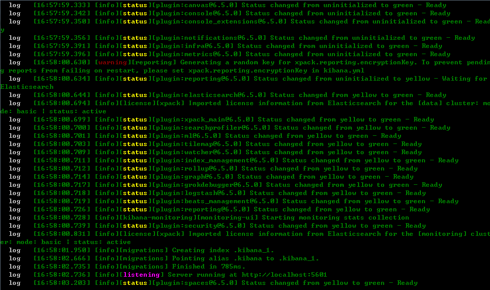 出现如下信息说明Kibana已经启动起来了,并且运行在本机的5601端口上。