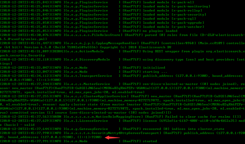 出现如下信息说明Elasticsearch已经启动起来了,并且运行在本机的9200端口上。