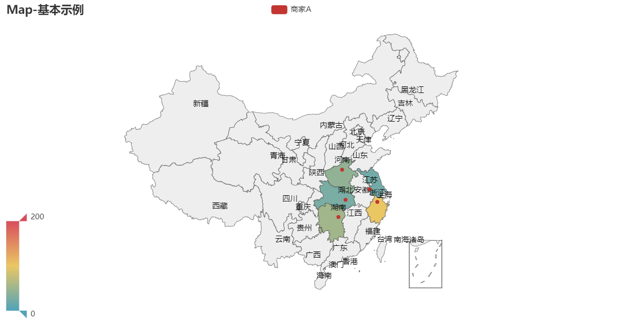 .add("商家A", [list(z) for z in zip(['江苏','浙江','湖北','湖南','河南'], [22,100,27,53,42])], "china")