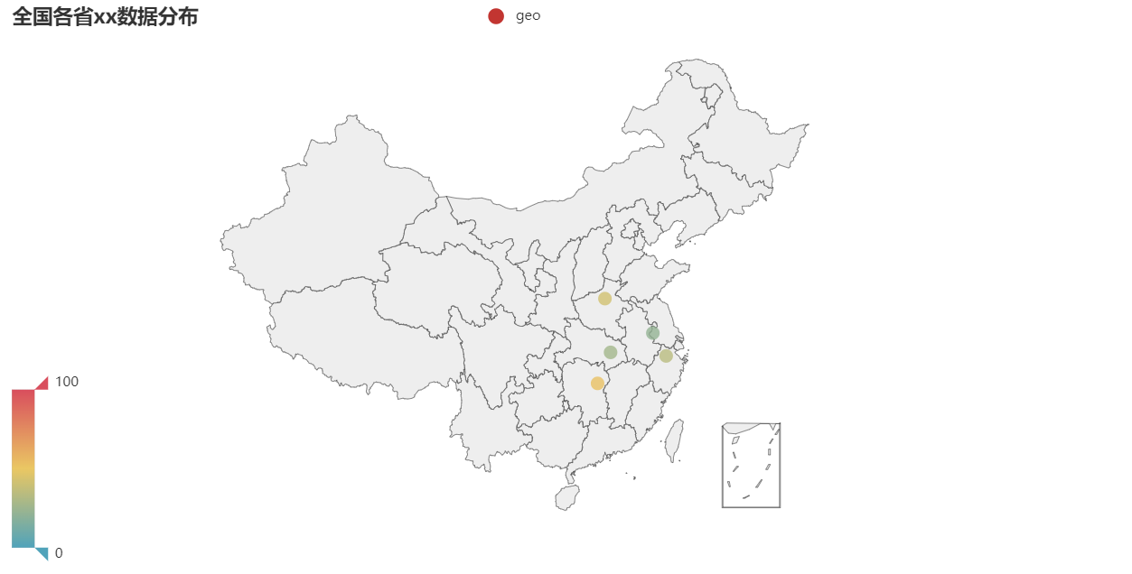 1、基本图表 采用全国地图,对各省的xx数据做分布展示,数据展示形式为圆点