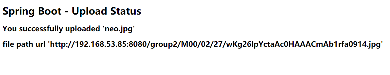 @PostMapping("/upload") //new annotation since 4.3 public String singleFileUpload(@RequestParam("file") MultipartFile file, RedirectAttributes redirectAttributes) { if (file.isEmpty()) { redirectAttributes.addFlashAttribute("message", "Please select a file to upload"); return "redirect:uploadStatus"; } try { // Get the file and save it somewhere String path=saveFile(file); redirectAttributes.addFlashAttribute("message", "You successfully uploaded '" + file.getOriginalFilename() + "'"); redirectAttributes.addFlashAttribute("path", "file path url '" + path + "'"); } catch (Exception e) { logger.error("upload file failed",e); } return "redirect:/uploadStatus"; }