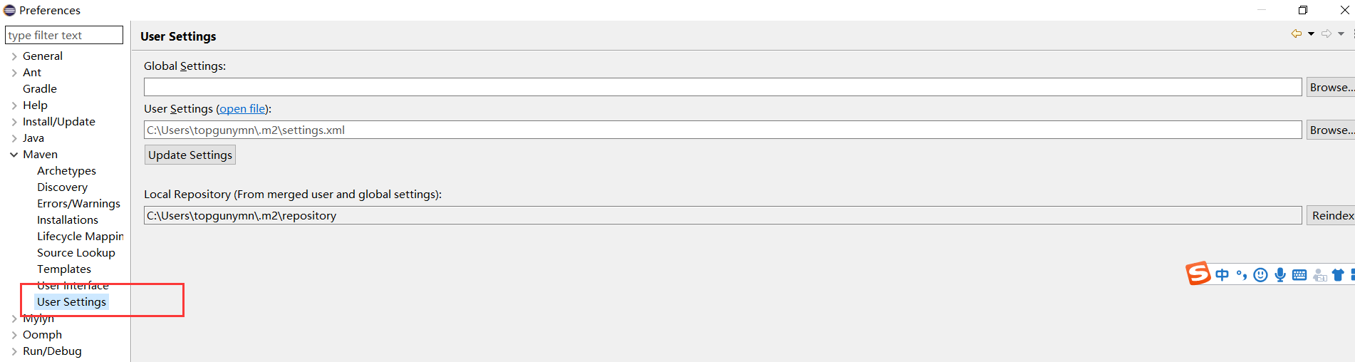 找到用户下面的,C:\Users\topgunymn\.m2的settings.xml文件,设置镜像文件地址,如果这个文件没有,请从maven的配置文件,conf下面复制过来