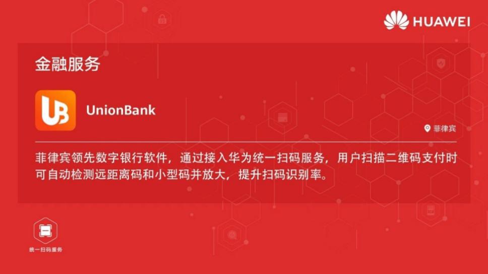 在大家生活中最重要的行业金融领域。菲律宾的数字银行UnionBank一直以来对于远距离扫码、收款码污损、反光等复杂场景没有很好的解决方案,还缺少同时支持华为和非华为机型的统一方案。通过接入HMS核心服务,灵活运用统一扫码服务,UnionBank实现了自动检测远距离码和小型码并放大,在码污损、反光的特殊场景下也能顺利扫码,有效提升用户扫码准确率。