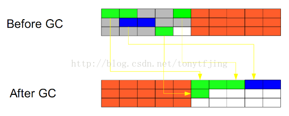 此算法结合了“标记-清除”和“复制”两个算法的优点。也是分两阶段,第一阶段从根节点开始标记所有被引用对象,第二阶段遍历整个堆,把清除未标记对象并且把存活对象“压缩”到堆的其中一块,按顺序排放。此算法避免了“标记-清除”的碎片问题,同时也避免了“复制”算法的空间问题。效果图如下: