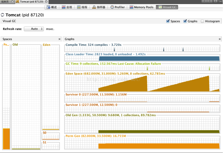 具体区域可以通过VisualVM中的VisaulGC插件查看,如图(openjdk 1.7):