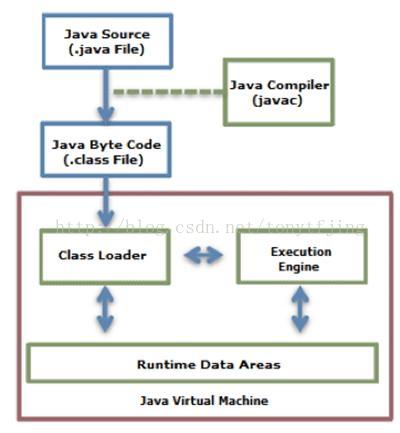 1.类加载器(ClassLoader):在JVM启动时或者在类运行时将需要的class加载到JVM中。(右图表示了从java源文件到JVM的整个过程,可配合理解。 关于类的加载机制,可以参考http://blog.csdn.net/tonytfjing/article/details/47212291)