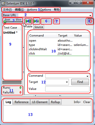1.文件:创建、打开和保存测试案例和测试案例集.编辑:复制、粘贴、删除、撤销和选择测试案例中的所有命令.Options : 用于设置seleniunm IDE.