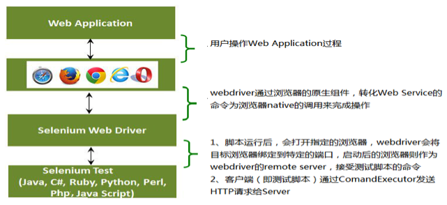 Selenium2.x 提出了WebDriver的概念之后,它提供了完全另外的一种方式与浏览器交互。那就是利用浏览器原生的API,封装成一套更加面向对象的Selenium WebDriver API,直接操作浏览器页面里的元素,甚至操作浏览器本身(截屏,窗口大小,启动,关闭,安装插件,配置证书之类的)。由于使用的是浏览器原生的API,速度大大提高,而且调用的稳定性交给了浏览器厂商本身,显然是更加科学。然而带来的一些副作用就是,不同的浏览器厂商,对Web元素的操作和呈现多少会有一些差异,这就直接导致了Selenium WebDriver要分浏览器厂商不同,而提供不同的实现。例如Firefox就有专门的FirefoxDriver,Chrome就有专门的ChromeDriver等等。(甚至包括了AndroidDriver和iOS WebDriver)