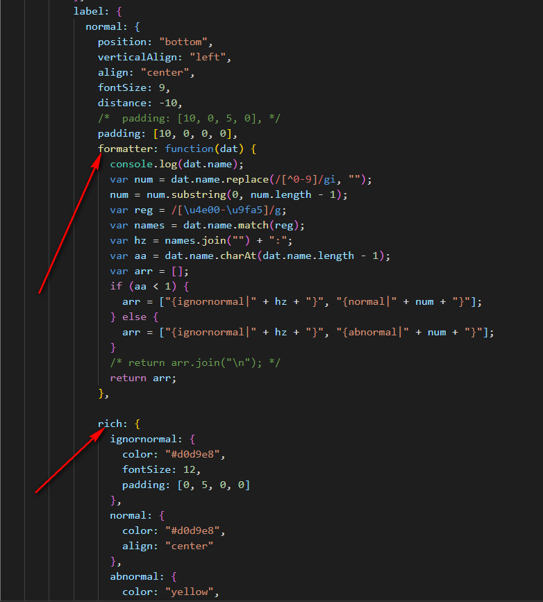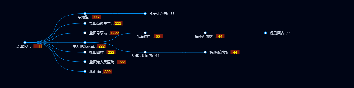 该部分是基于echarts(tree型图)开发的,其data数据格式有限制(详情见文件:关系图数据格式.text),数据中的name字段包含label标签的所有数据信息,报警及非报警状态时label中字体及背景颜色,是echarts中的富文本结合正则实现的,具体配置如下: